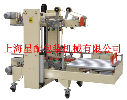 紙箱經(jīng)前段封箱機(jī)中間上下封口后,進(jìn)入90度轉(zhuǎn)角機(jī)松,由推箱板推入角邊封箱機(jī)封箱機(jī)構(gòu);紙箱上下四角邊同時(shí)自動(dòng)封口、撫平;